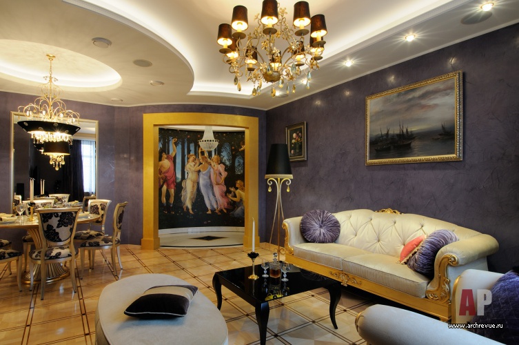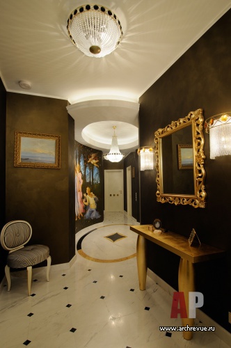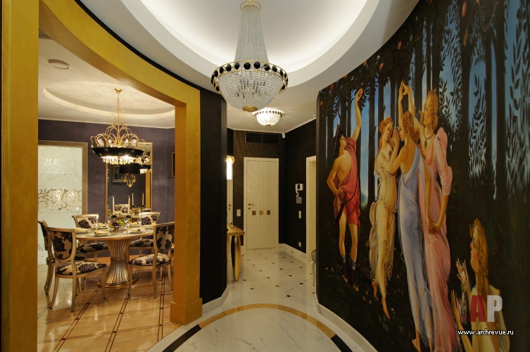 Овальный холл является отправной точкой всего интерьера. Благодаря росписи на радиусной стене он становится главным стилистическим акцентом – из гостиной, вход которой оформлен в виде золоченого багета, роспись выглядит картиной.