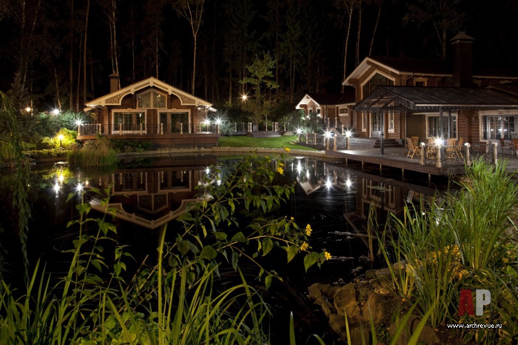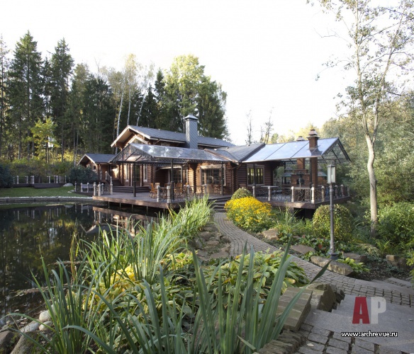 Хозяева подмосковной усадьбы решили возвести на лесном участке два дома на берегу лесного озера. Расположение построек определило стилистику оформления и выбор материалов: оцилиндрованного бревна, сланца на крышах, дощатых террас.
