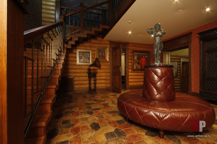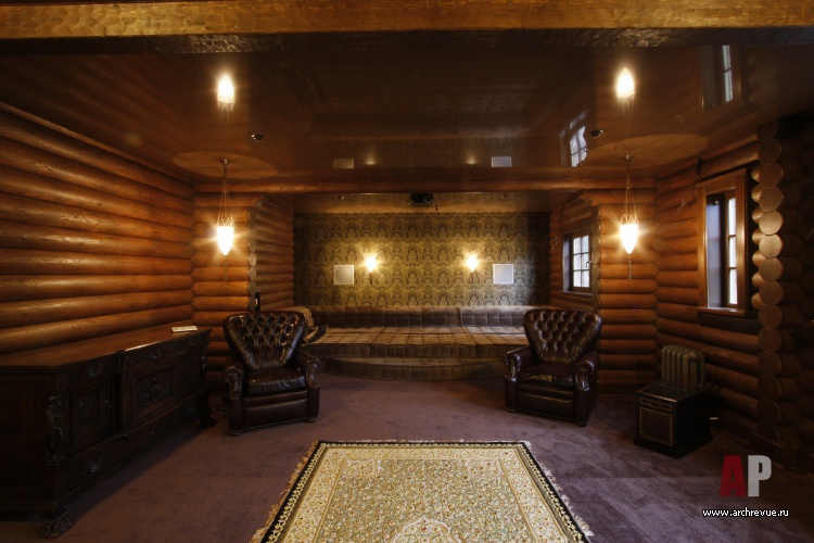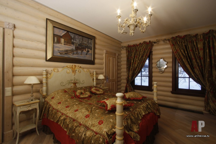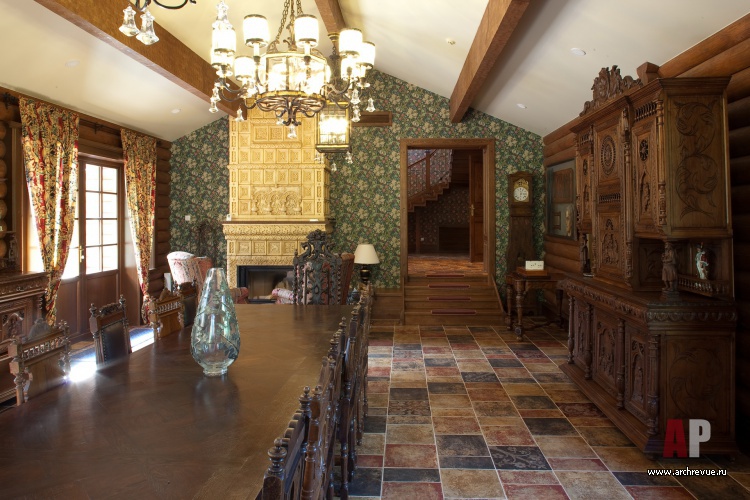 Бревенчатые стены тонированы по-разному: в женской спальне их выбелили, в мужской - затемнили, а в комнате отдыха и вовсе сделали голубоватыми. Встречаются здесь и английские обои от Morris&Co и панели с росписью, выполненной с применением золота и серебра.