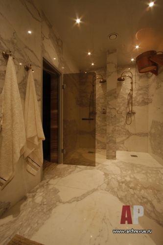 Стены оцилиндрованное бревно, покраска, гипсокартон, обои Morris Corner, мрамор Calacatta