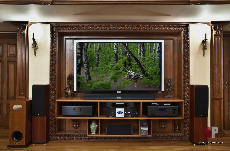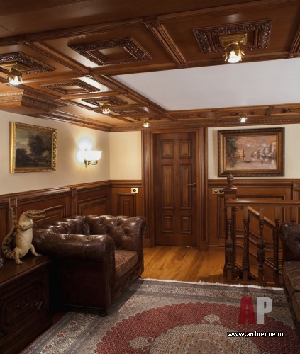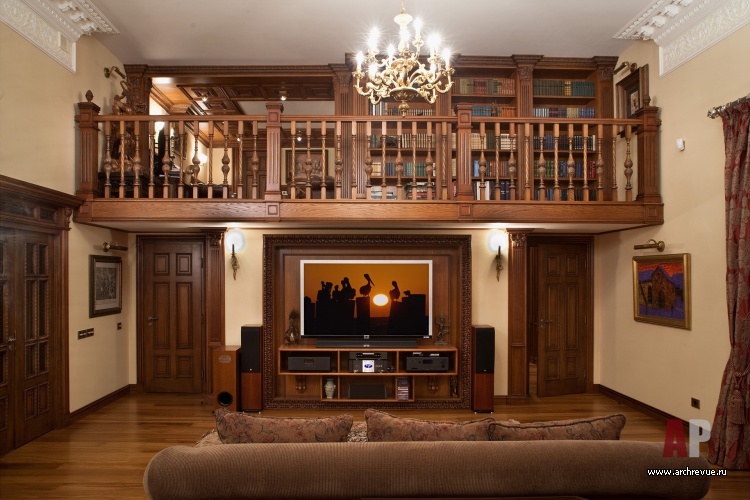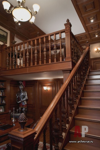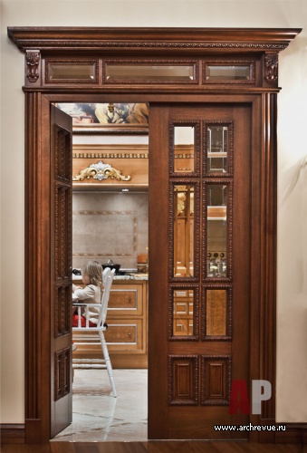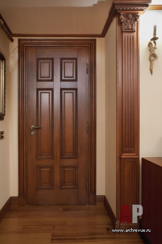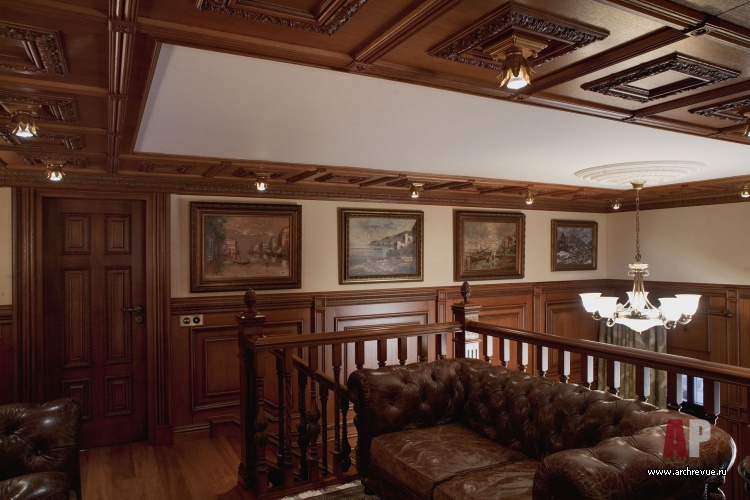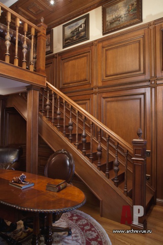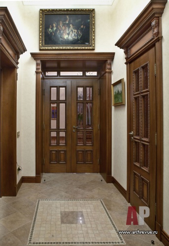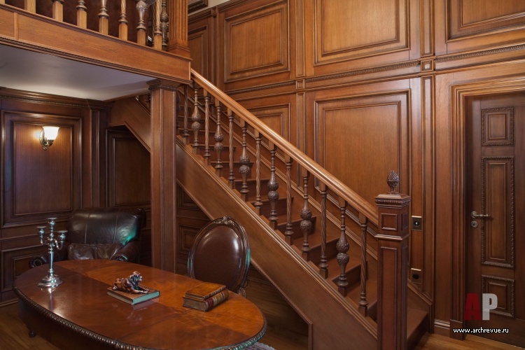 Порталы дверей, кессонные потолки, настенные панели, балюстрада балконов, лестницы, карнизы и плинтуса были выполнены на заказ на московском производстве. Столярные изделия украшены декоративной резьбой с классическим орнаментом.