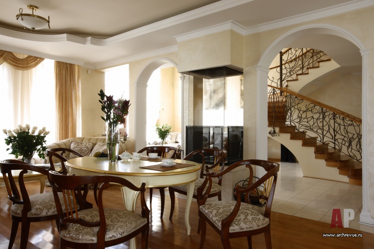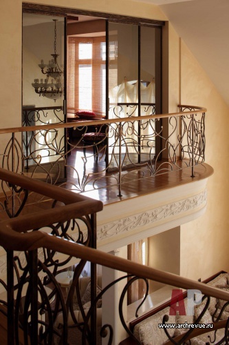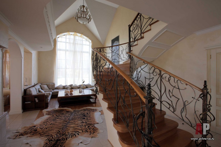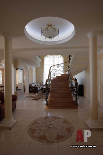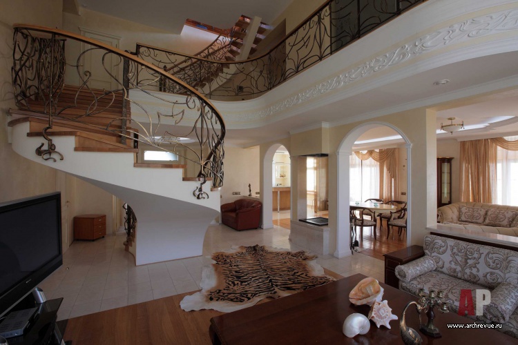 Структура особняка вполне традиционна: первый этаж отдан под общественные зоны, второй занимают приватные помещения хозяев дома и их троих детей, а третий этаж полностью превращен в центр отдыха с тренажерным залом и банным комплексом. Смысловой центр дома – двухсветная гостиная с лестницей в духе ар-деко. Легкая, винтовая конструкция с ажурной ковкой выполнена по эскизам авторов проекта.