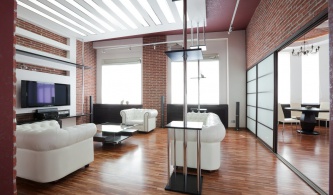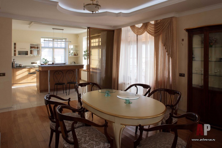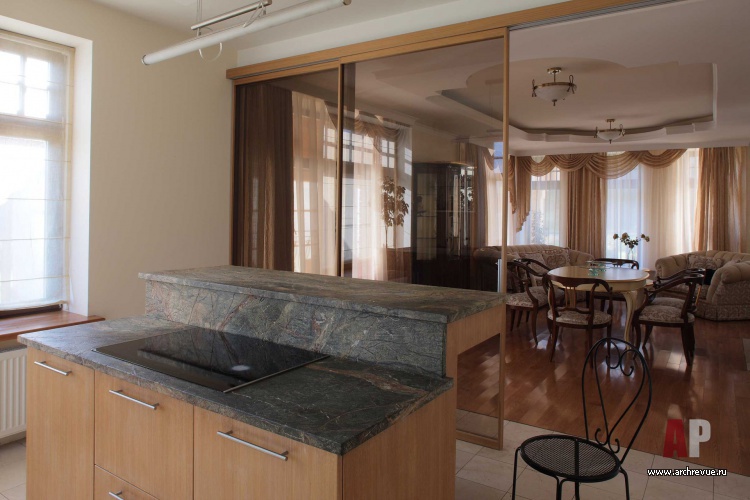 В итоге гостиную от столовой авторы отделили арочными конструкциями, а кухню выделили стеклянными раздвижными дверями.