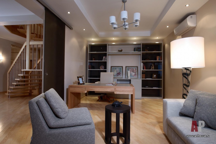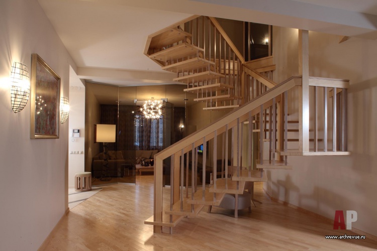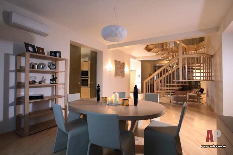 Квартира организована на двух уровнях. Смысловым и визуальным центром квартиры является винтовая лестница. Вокруг нее формируются на первом этаже общественные помещения (кухня, гостиная-столовая, кабинет), а на втором этаже – приватные.