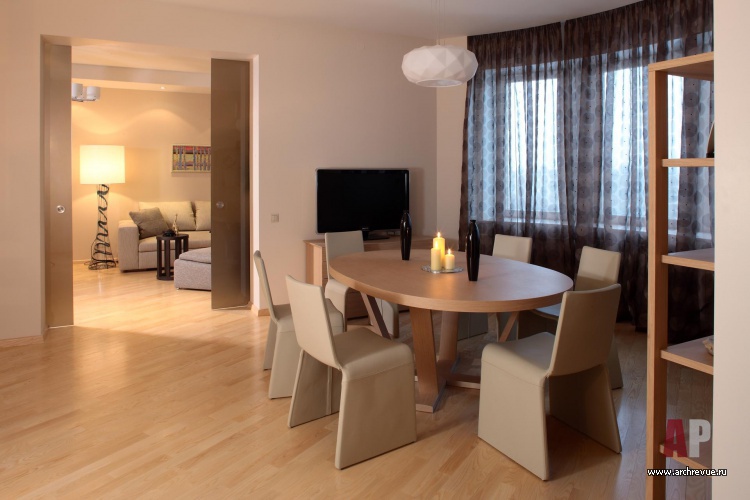 Мы старались создать иллюзию загородного дома: тихое, спокойное, идеальное для отдыха место. Именно поэтому здесь солирует воздух, а комнаты свободно перетекают друг в друга. Основной задаче служит и светлое дерево (массив ясеня и беленый дуб), которое применялось в большом количестве. Особое внимание мы уделили свету. Здесь заложено много световых сценариев, что сближает квартиру с европейским жильем.
