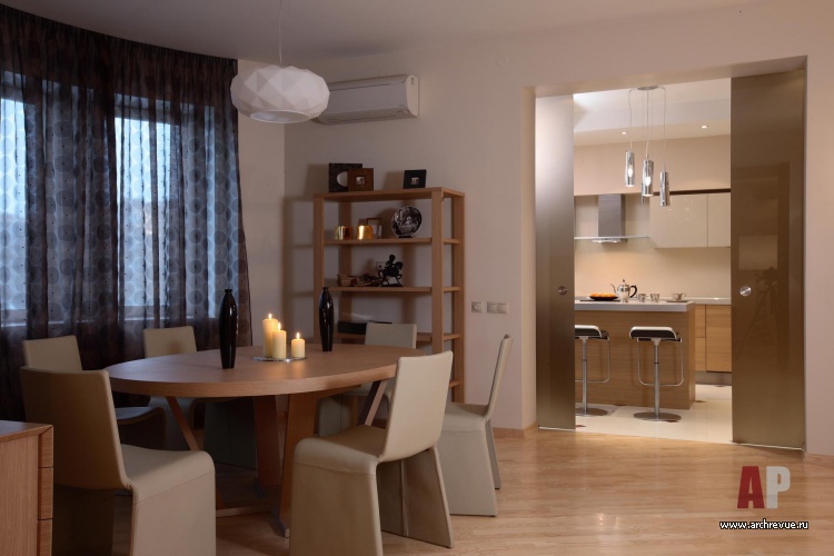 Чтобы создать ощущение светлого, наполненного воздухом пространства, авторы используют высокие (до потолка) раздвижные двери и стеклянные перегородки. Они зрительно увеличивают и объединяют комнаты.