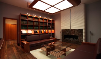 Связь жилого помещения и внешней среды поддерживается и за счет декорирования интерьеров сюжетами на тему ландшафтного дизайна. Например, небольшой зимний сад, разбитый на подиуме в гостиной. Перегородка, представляющая собой композицию из матового стекла и отлитых из бетона скульптурных объектов, напоминающих деревья между холлом и кабинетом. И, наконец, репродукция картины «Весна», написанная Сандро Боттичелли как гимн природного и жизненного обновления.
