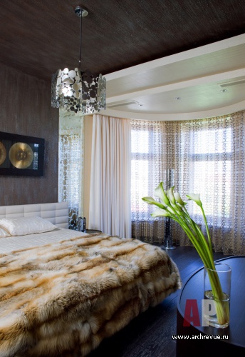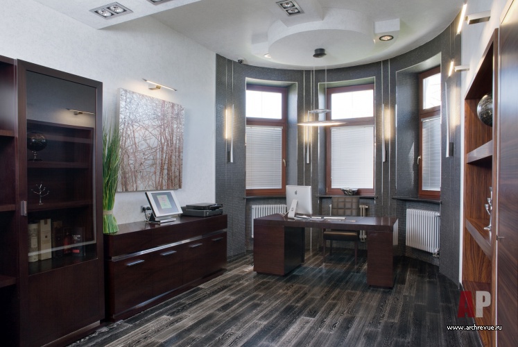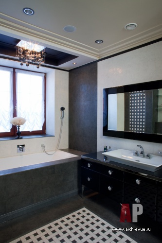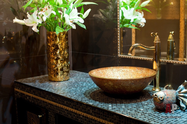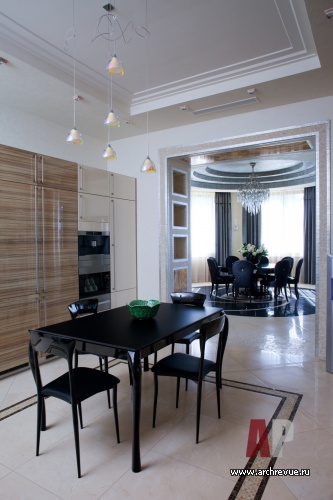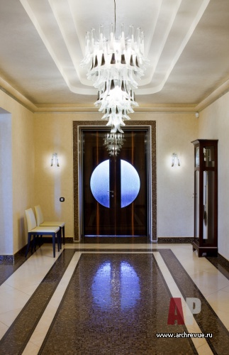 Интерьер в стиле американского ар-деко строится на контрасте черного и белого цветов, а также матовых и глянцевых фактур. В отделке применены декоративные штукатурки, мозаика, натуральное дерево (макасар под рояльным лаком) и мрамор. Декоративные акценты смещены на пол: полы всех гостевых помещений украшены эффектными панно из мраморной мозаики.
