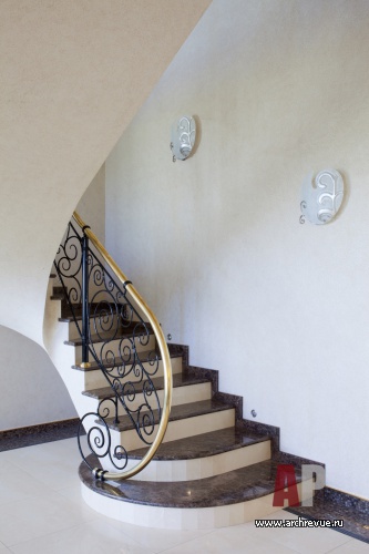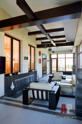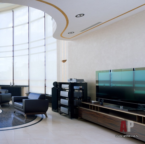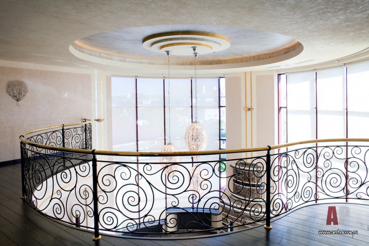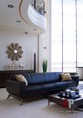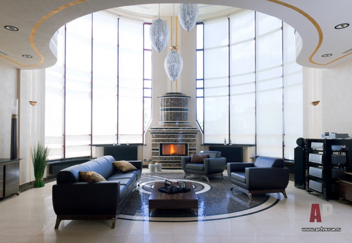 Пространство дома решено как набор открытых, внушительных по объему перетекающих друг в друга помещений. Центральное место в доме – двухсветная гостиная (площадью 70 кв. м) с панорамным полукруглым эркером. Ее визуальный образ сформирован пластикой балкона второго этажа, полукруглая апсида придает помещению парадный вид. К гостиной примыкает столовая, перетекающая в кухню и просторная терраса с водопадом. Она играет роль зимнего сада.