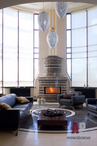 Визуальная доминанта гостиной – оригинальный камин, выполненный по авторским эскизам. Его форма в виде композиции из двух массивных цилиндров отсылает к основной теме архитектурного решения дома. Обрамление камина выполнено из трех сортов мрамора: Crema Marfil, Nero Markina и Imperador Dark.