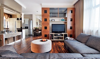 Применены простые, традиционные отделочные материалы: полированный тиковый паркет, светлые матовые финишные отделки стен, керамическая плитка в прихожей и санузлах. Характерная особенность – раздвижные двери из стекла и отделяющая кухню перегородка, зашитая деревянными панелями.