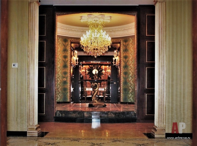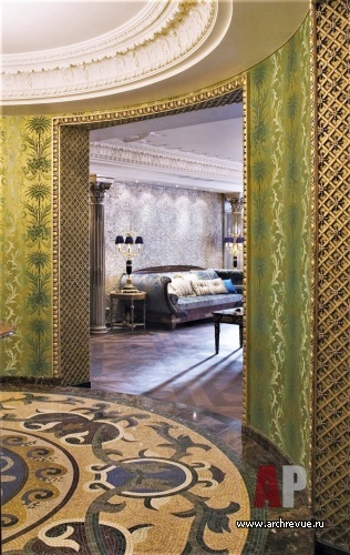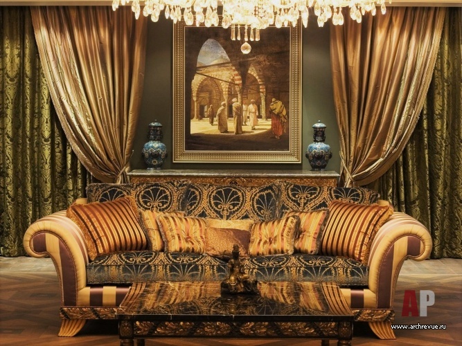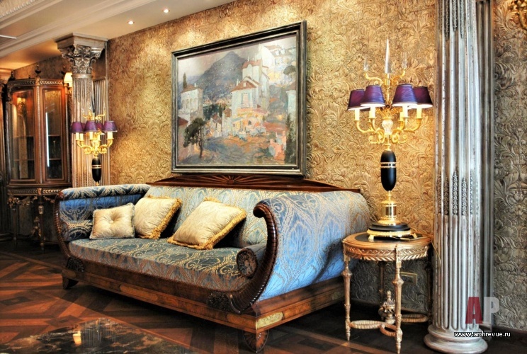 Хозяин квартиры пожелал оформить квартиру в классическом стиле, соединив в ней имперский Рим и Восток. Обустройство дома заказчик начал с похода по музеям: посетив Эрмитаж и Петергоф, он уверился в том, что роскоши много не бывает.
