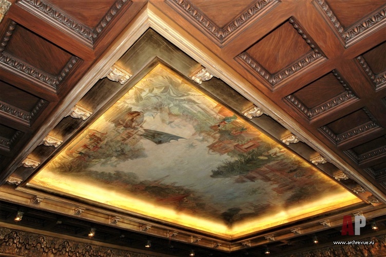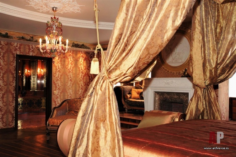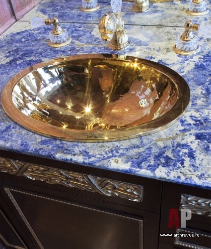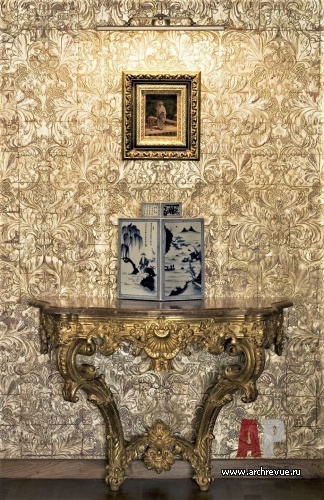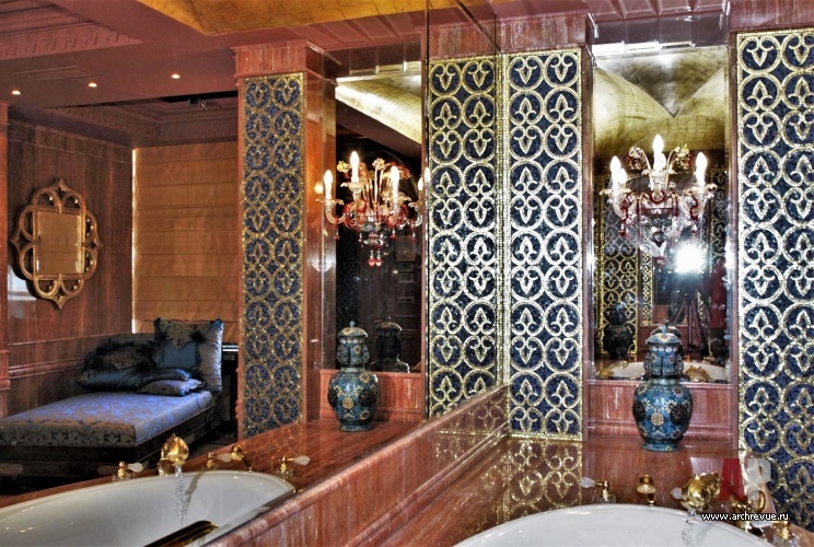 Приватные пространства оформлены обоями Zuber. Они напечатаны вручную с использованием досок XVIII века. Эти матрицы ни разу не реставрировались (иначе пропадет историческая достоверность), на них есть сколы и выбоины, поэтому рисунок получается неравномерным, есть вообще непропечатанные участки. Именно это и придает таким обоям ценность. Ванные комнаты декорированы красным травертином и мозаикой из содалита (редкого синего мрамора). Столь эффектную картину дополняют панели из резного дерева, авторские росписи, гипсовая лепнина, состаренная позолота и зеркала. Вместо обычной амальгамы в них использована бронза. Когда смотришь на себя в такое зеркало, кажется, что кожа чуть тронута загаром.