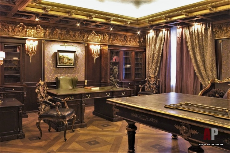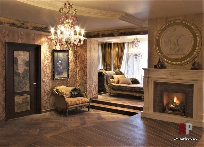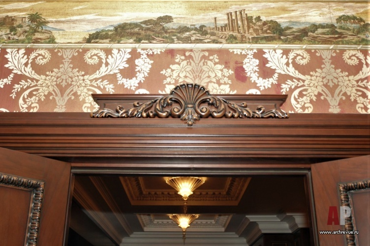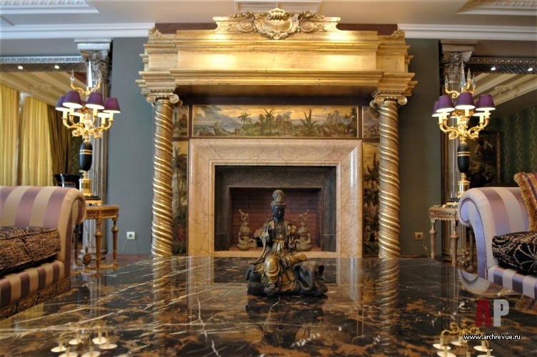 Интерьер представляет собой плотно сотканное из эксклюзивных деталей и предметов полотно. Все они демонстрируют поистине имперский подход и овеяны ореолом историзма. Стены в гостиной оклеены линкрустом, который благодаря сложной декоративной покраске смотрится как патинированный металл.