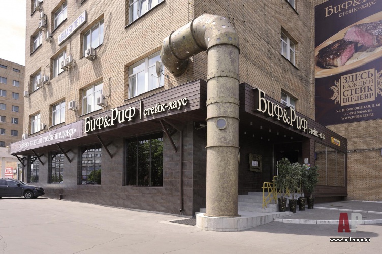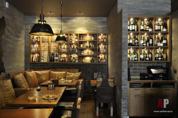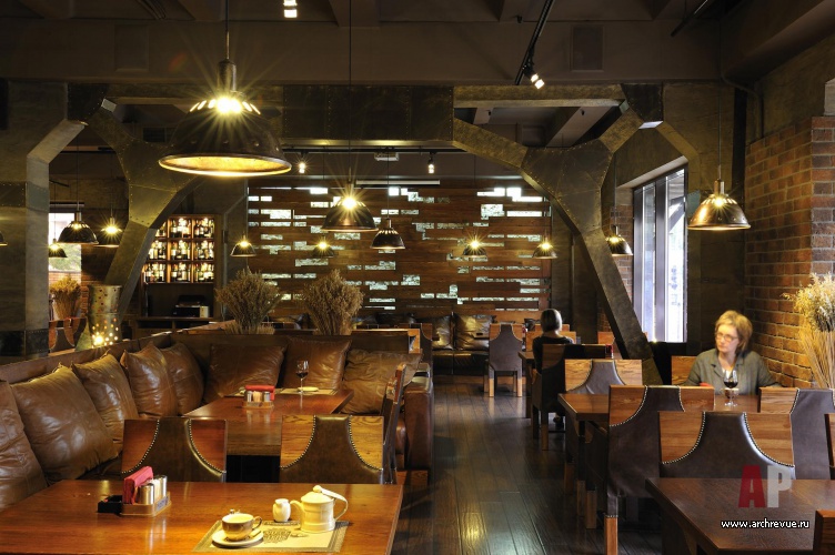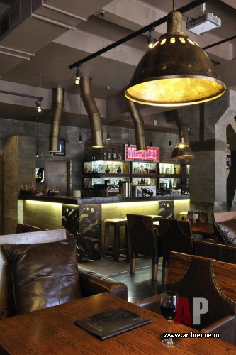 Мы стремились отойти от стереотипов оформления мясных ресторанов, поэтому решили пространство как единый зал, без дополнительных VIP- комнат. Мы стремились, чтобы заведение получилось с ярко выраженным мужским характером, однако при этом не хотели, чтобы он выглядел излишне аскетичным, скучным, выхолощенным… И здесь нам на руку сыграл сам конструктив помещения, который мы подчеркнули покрасками, кожаными накладками и отделками. С ними прекрасно сочетаются металлические трубы, которые появляются в неожиданных местах помещения: на входе, вокруг барной стойки, под потолком уютных зон.