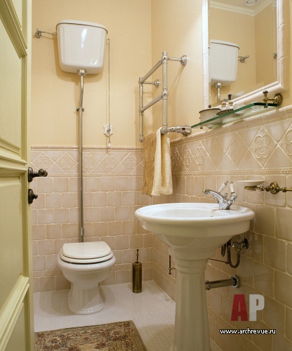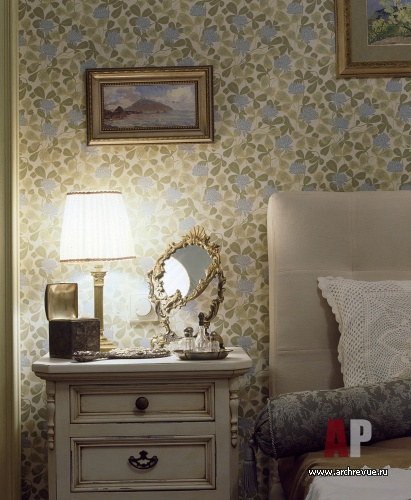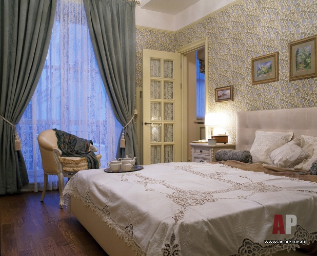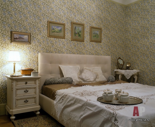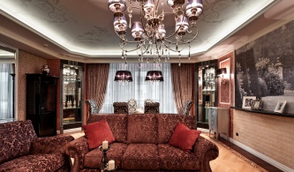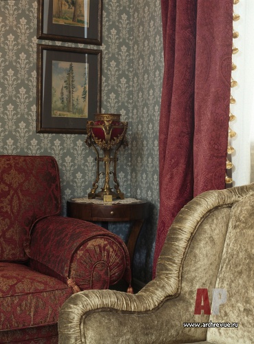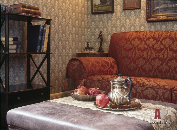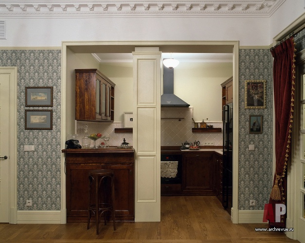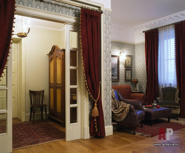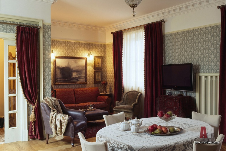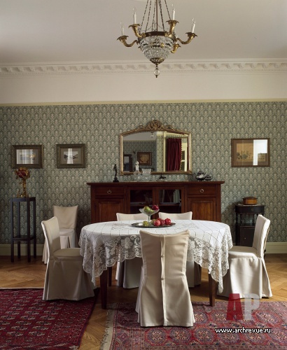 Потолки украшены классическим лепным карнизом. На полу – характерный для быта москвичей начала прошлого века дубовый паркет «елочкой». Особый уют в интерьере создают текстиль и аксессуары: кружева ручной работы, столовое серебро, обои с мелким, пестрым орнаментом, ковры насыщенного красного цвета.