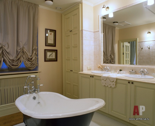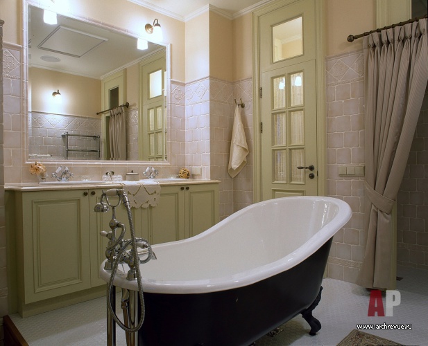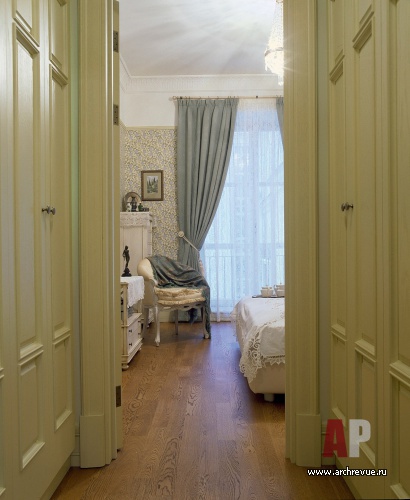 Интерьер квартиры решен в традиционной стилистике, характерной для московских особняков начала ХХ века. Распашные и раздвижные белые двери с фацетным стеклом установлены во всех помещениях, даже в ванной комнате, которая соединяется со спальней.