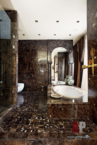 Из этого мрамора выполнен и портал камина. Его облик дополнен резными литыми элементами. Интерьер отличает авторский дизайн мебели, дверей и фурнитуры.