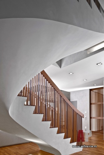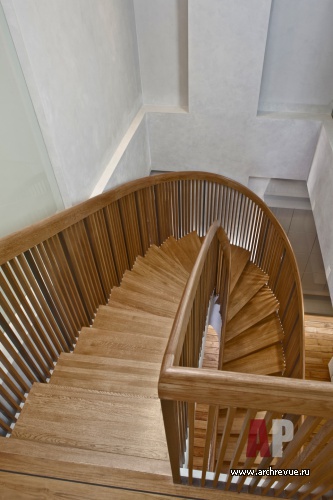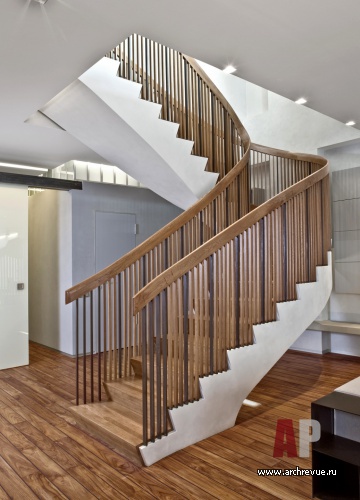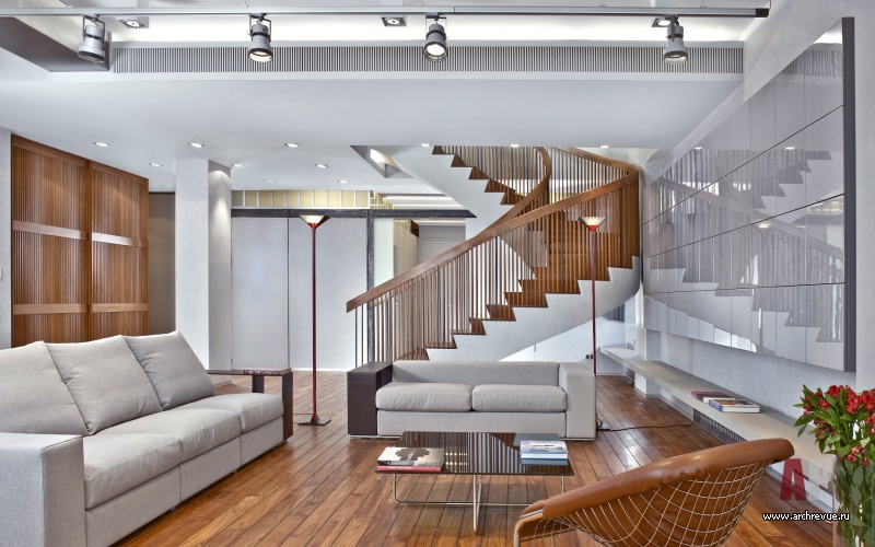 Пространство квартиры организовано на двух уровнях. Авангардная по своей форме лестница является центральным элементом пространства и вынесена в общую гостевую зону. Первый этаж решен по принципу студии с логично перетекающими друг в друга функциональными зонами. Второй уровень (он был организован на месте бывшего чердака) занимают приватные апартаменты хозяев.