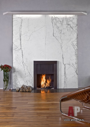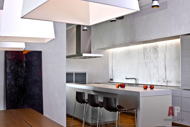 Интерьер кажется невесомым благодаря серо-жемчужной цветовой палитре (которая совпадает с цветом неба за окном), грамотно организованному дневному освещению, использованию материалов, которые позволяют манипулировать с пространством. Камин и кухонный фартук выполнены из полированного мрамора светло-серого оттенка, который растворяется на фоне плотно-серых стен.
