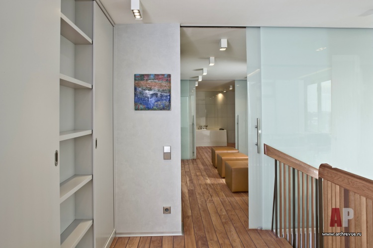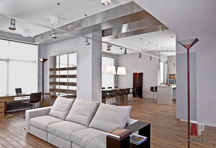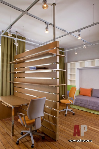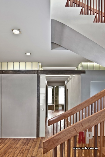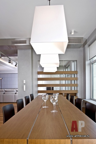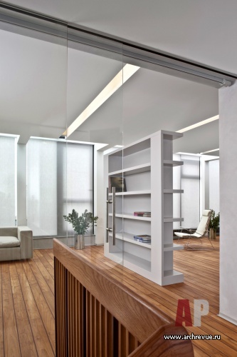 Вместо глухих перегородок архитектор использует или стеклянные панели (прозрачные и матовые) или деревянные «ширмы», набранные из тонких реек. Интерьер выстроен на горизонталях - остров кухни, вытянутый стол в столовой, подоконники, книжный стеллаж, светильники на направляющих, системы хранения как бы разрывают границы помещений.