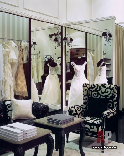 Интерьер магазина исполнен в традиционной классике и выглядит торжественно. Стены оформлены панорамными зеркалами от пола до потолка: они позволяют покупательнице лучше себя рассмотреть и одновременно визуально расширяют помещение.