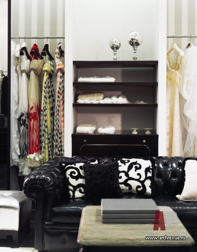 Салон-магазин решен как большой, просторный зал. Вешала с платьями размещены по периметру, аксессуары разложены на полках и витринах. Примерочные с большими, панорамными зеркалами находятся в торце помещения. По центру зала расположены диванные зоны для отдыха после утомительных примерок.