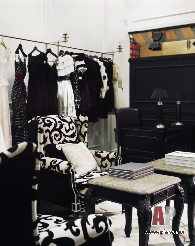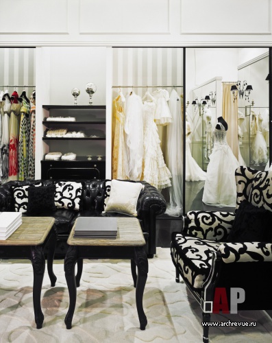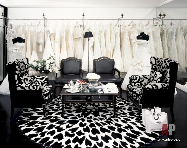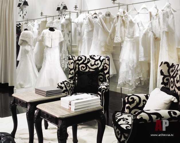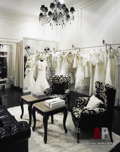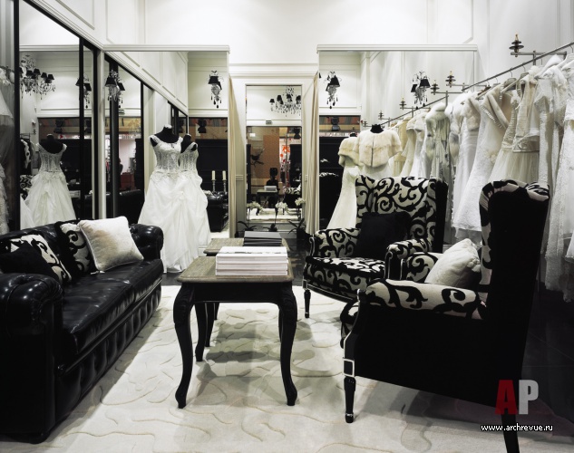 Интерьер салона свадебного и вечернего платья haute couture авторы проекта предложили оформить в беспроигрышной классической стилистике и черно-белой цветовой гамме. Сдержанный и одновременно элегантный интерьер – идеальный фон для роскошных, богато украшенных кружевом, вышивкой и стразами платьев.