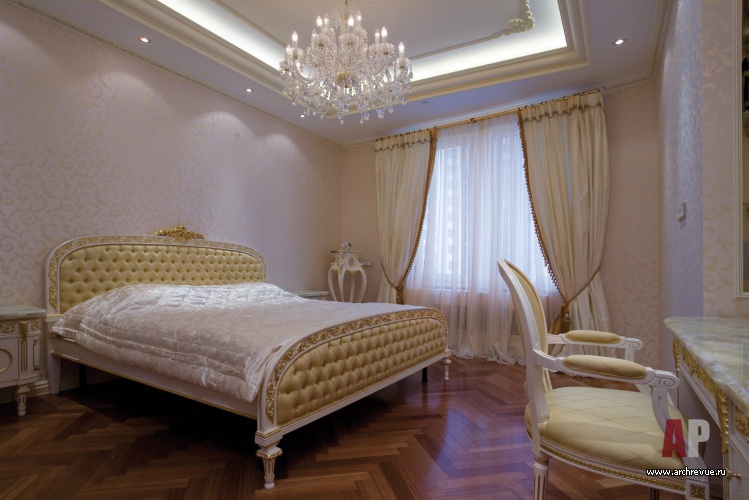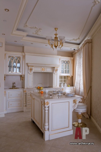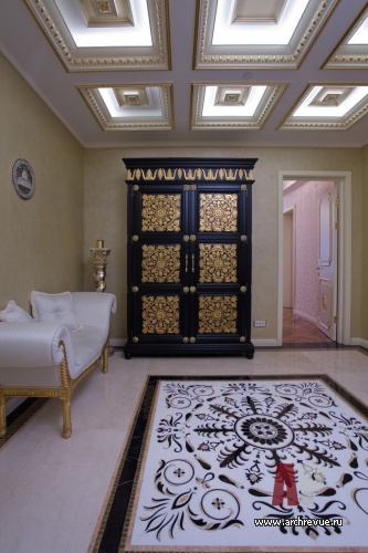 Авторы проекта выбрали элегантный дворцовый стиль и изысканную палитру в золотисто-сливочных тонах. В отделках использованы натуральные материалы и классические архитектурные приемы. Выразительный декоративный элемент – кессонные гипсовые потолки с позолотой – придают интерьерам торжественный и респектабельный вид.