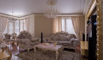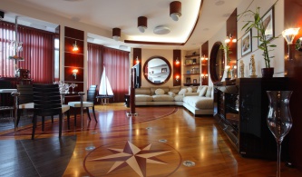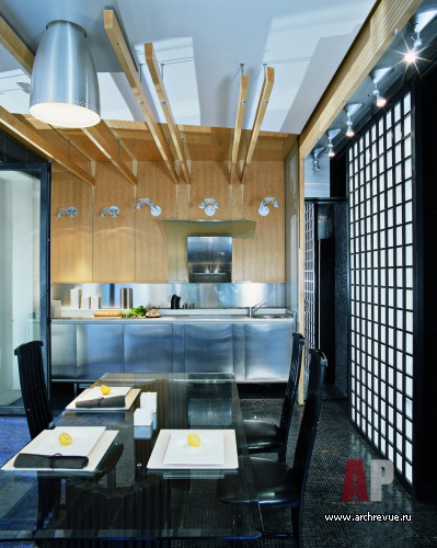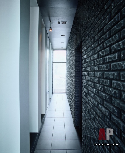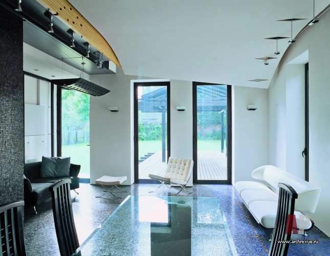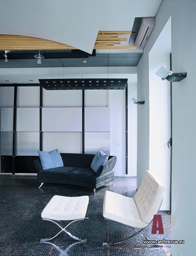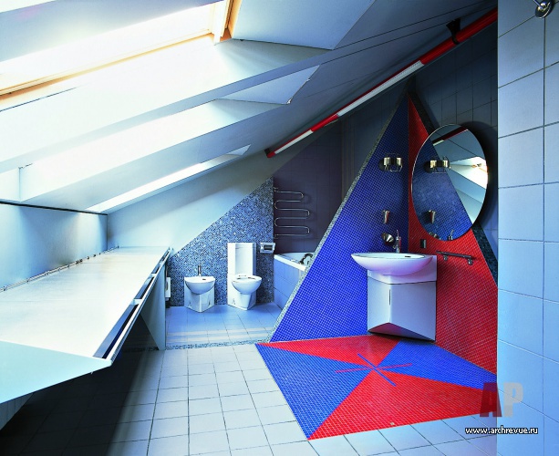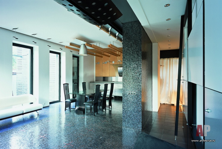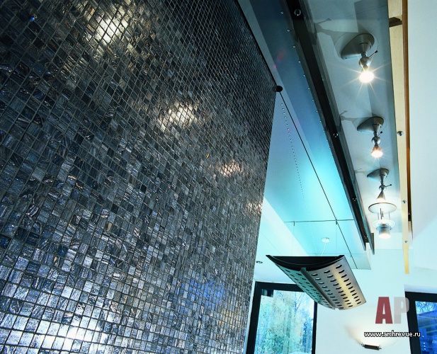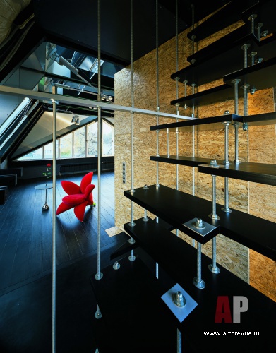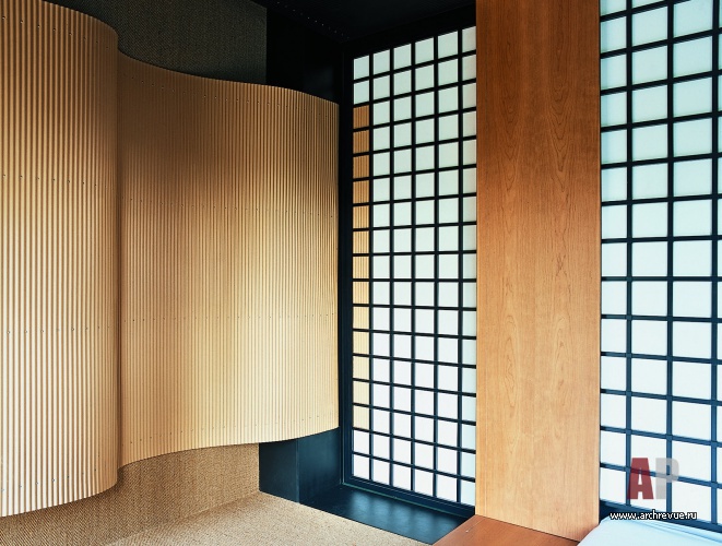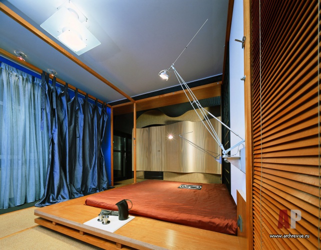 В отделе интерьеров использован черный фасадный камень, мозаика, тонированное дерево, стекло и покраски. Одно из наиболее интересных помещений – мансарда. Вход в нее обозначен конструктивисткой аркой из древесно-стружечных панелей. В спальнях заметна японская тема.