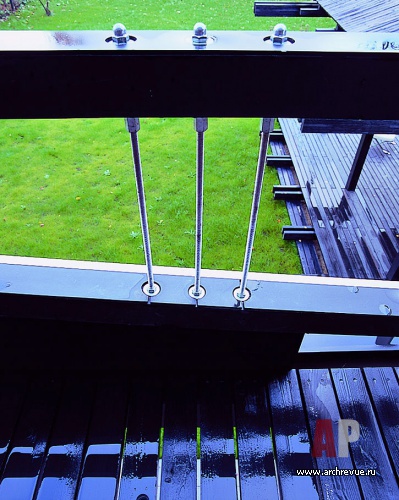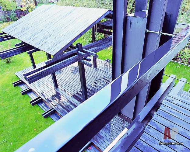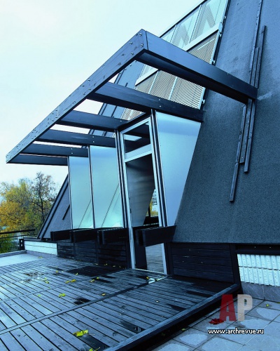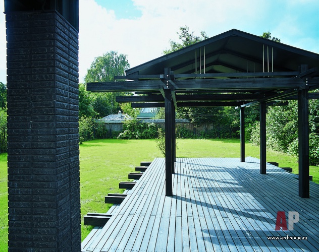 Заказчики обратились с пожеланием увеличить площадь уже существовавшего на участке дома: достроить его ввысь и пристроить дополнительный объем гаража с жилыми помещениями. Поскольку на территории района действуют жесткие градостроительные нормативы, то задача, поставленная перед архитектором, оказалась не простой. Чтобы дом выглядел сомасштабным окружению, архитектор поднял двускатную кровлю основного объема на высокие стропила. Благодаря чему дом увеличился по площади, но сохранил стройность.