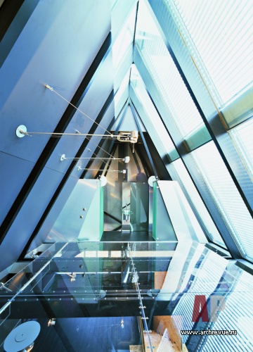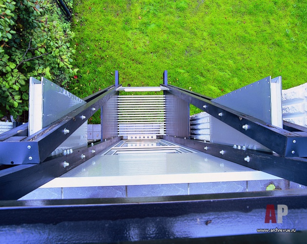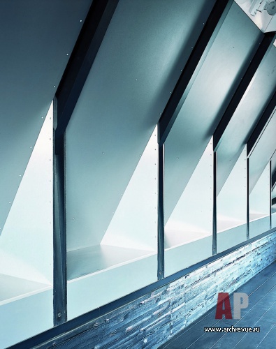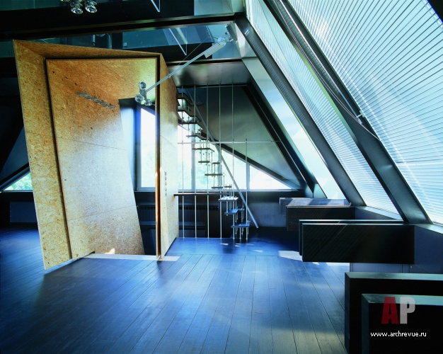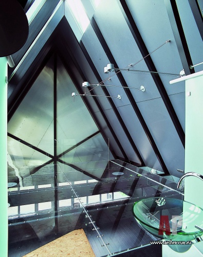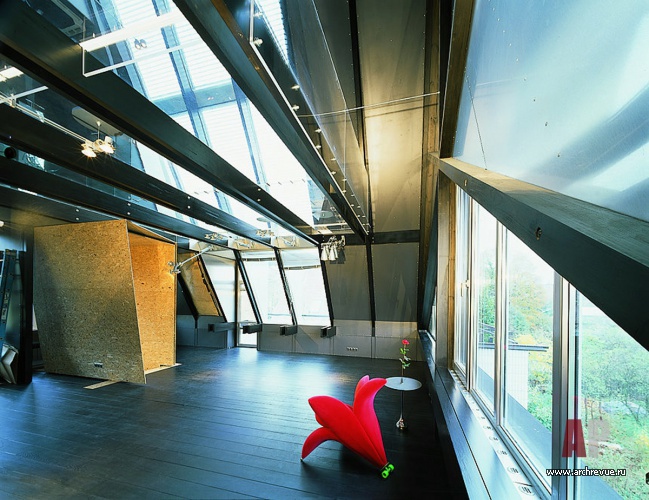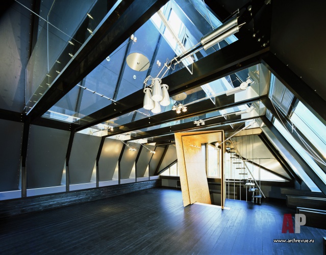 Мансарда представляет собой большой зал с треугольными окнами и застекленными проемами между стропилами. Высокий объем разделен на два уровня стеклянным потолком, укрепленным на массивных поперечных балках. На четвертом уровне со стеклянным полом находится спальня старшего сына.