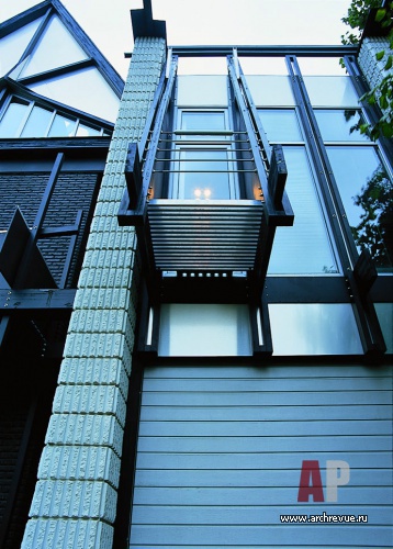 В ходе реконструкции дома образовалось два контрастных объема, они соединены узкой стеклянной галерей и имеют мансарду под острой кровлей. Пространство дома организовано на четырех этажах. На первом этаже находится гостиная, столовая, кухня и кабинет, на втором этаже спальни родителей и детей.