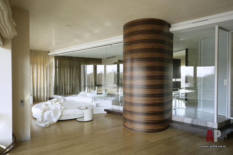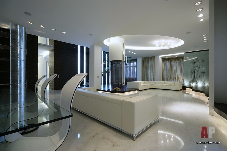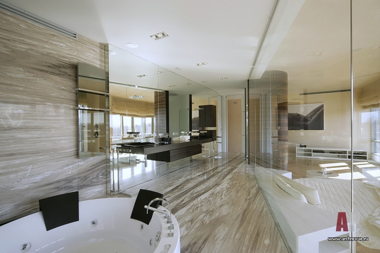 При всей простоте интерьер выглядит роскошно благодаря панелям из шпона макасара, натуральному мрамору, авторским элементам декора. Самый запоминающийся из них – стеклянное панно-водопад в гостиной с изображением скульптуры Кановаса «Три грации», хранящейся в Эрмитаже.
