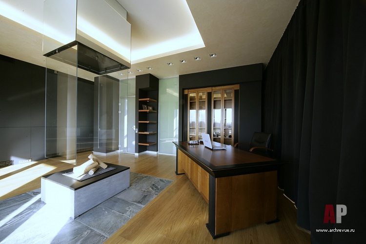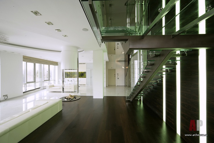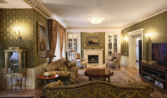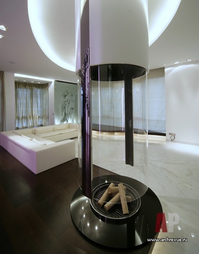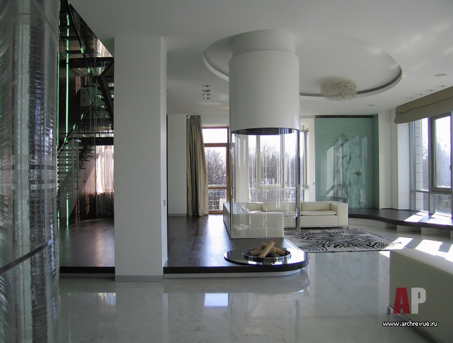 Квартира организована по принципу загородного дома. Первый уровень занимают гостевые помещения: гостиный зал с камином и столовой (площадью 100 кв. м), кухня и спальни для гостей.