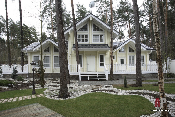 Двери, оконные рамы и декоративная балюстрада двух входных групп также выполнены из выкрашенного в белый цвет дерева.