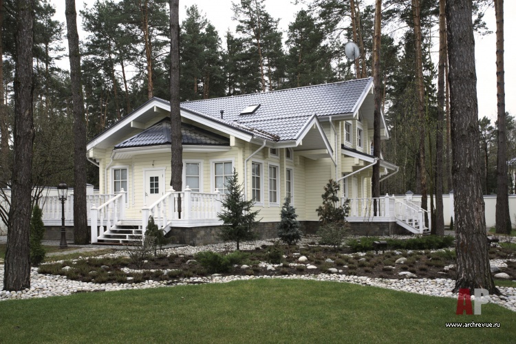 Двухэтажный банный комплекс расположен вблизи главного дома, выполненного в стиле усадебной классики. Постройка из клееного бруса и каменный дом с классическим порталом и лепными колоннами составляют единый ансамбль. Фасады банного комплекса выкрашены в пастельный желтый цвет, выносы кровли подшиты белой доской.
