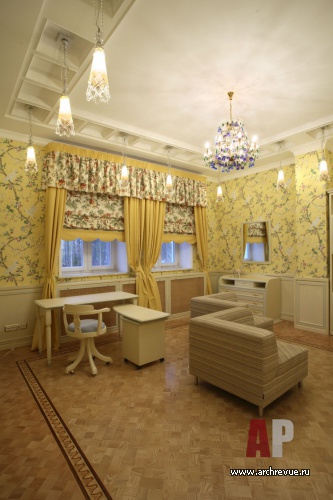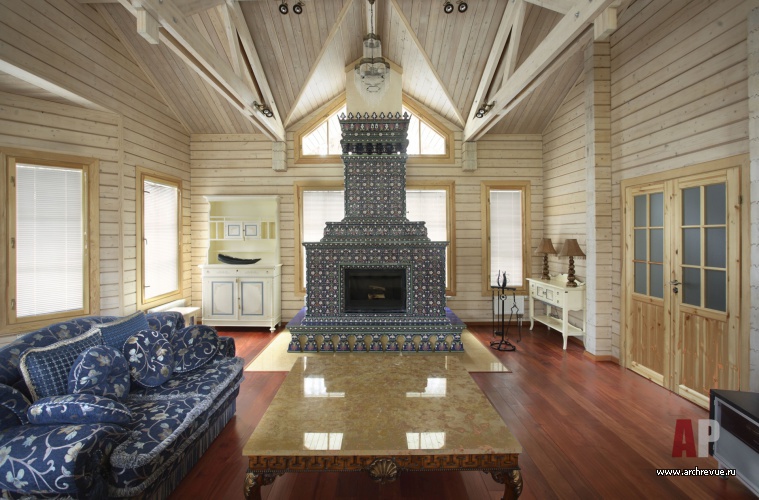 Центральный элемент гостиной – изразцовая печь. Изразцы ручной работы изготовлены в реставрационной мастерской по воссозданным технологиям XVII века. Второй этаж оформлен в традиционном ключе с применением обоев, гипсового декора, штучного паркета.