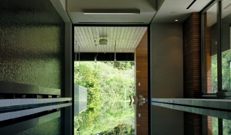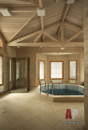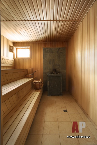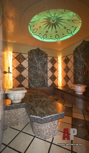 В банном комплексе два входа: один ведет сразу на второй этаж, в гостевые помещения, другой – непосредственно в зону релакса с турецким хаммамом, сауной, дровяной печью и аквазаной. Сразу за входом открывается зона отдыха – просторная гостиная с изразцовой печью и диванами.