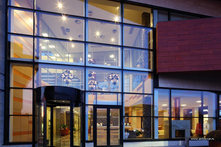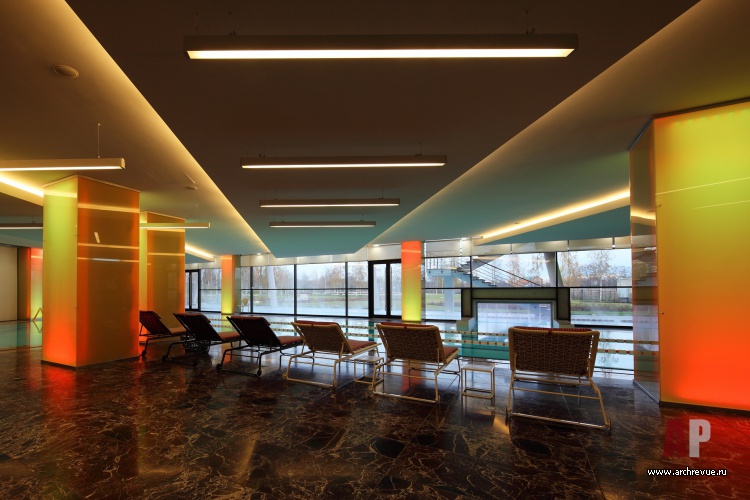 Клуб расположен в живописном ландшафте среди высоких деревьев и благодаря обилию стекла и открытых террас ориентирован на открывающийся пейзаж. В отделке велнес-центра использованы современные инновационные материалы и технологии.