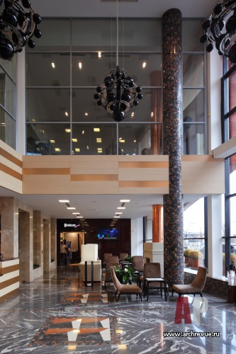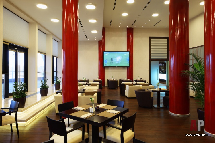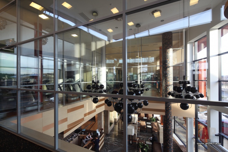 Современный облик клуба отличается открытостью, натуральными отделочными материалами, великолепно поддерживающими природную тему. Благодаря высоким витражным окнам он выглядит продолжением ландшафта. Дерево, камень, цветное и прозрачное стекло поддерживают тему единения интерьера и пейзажа.