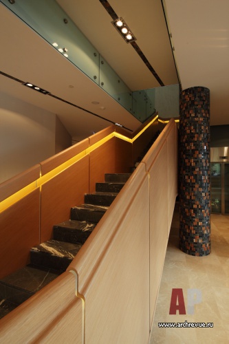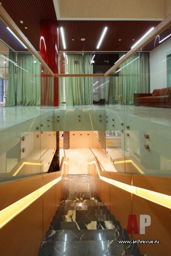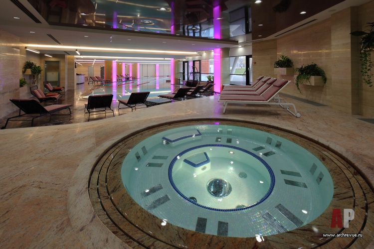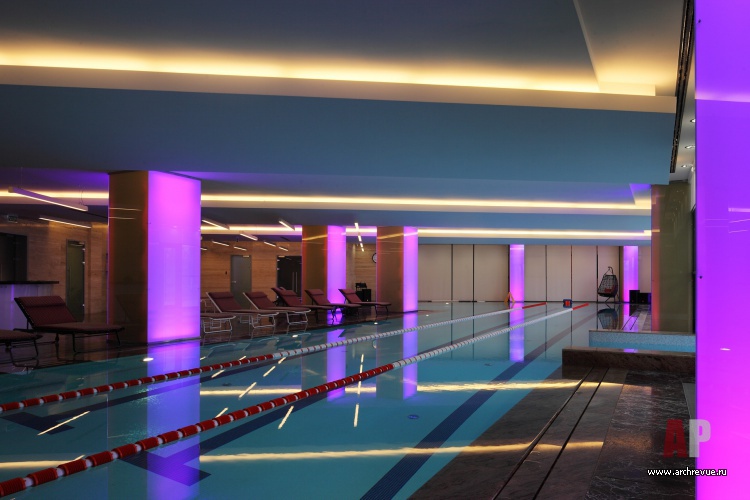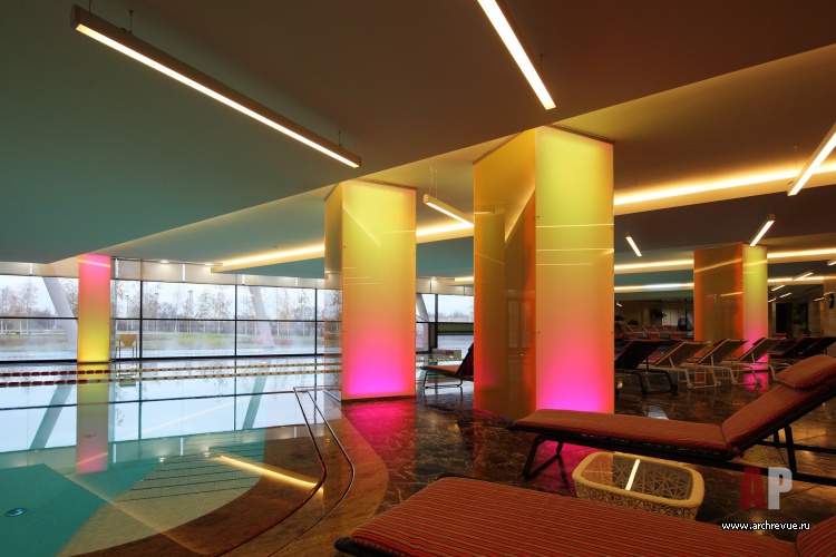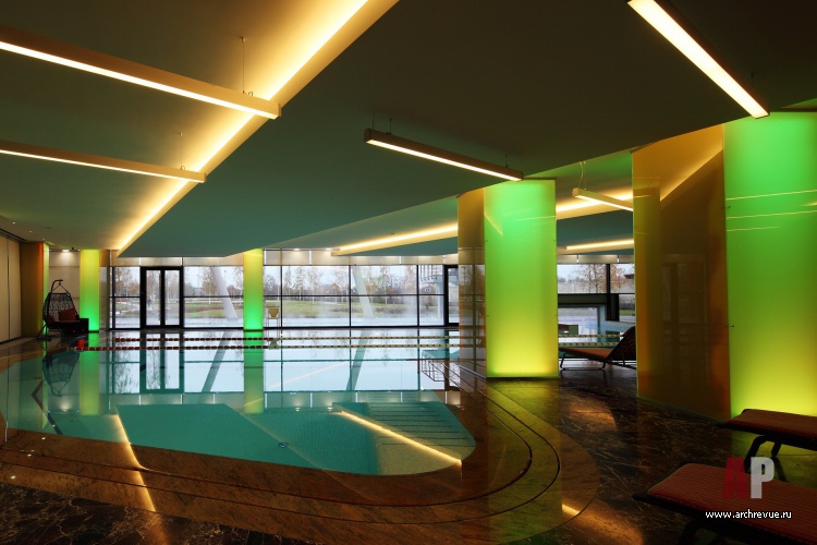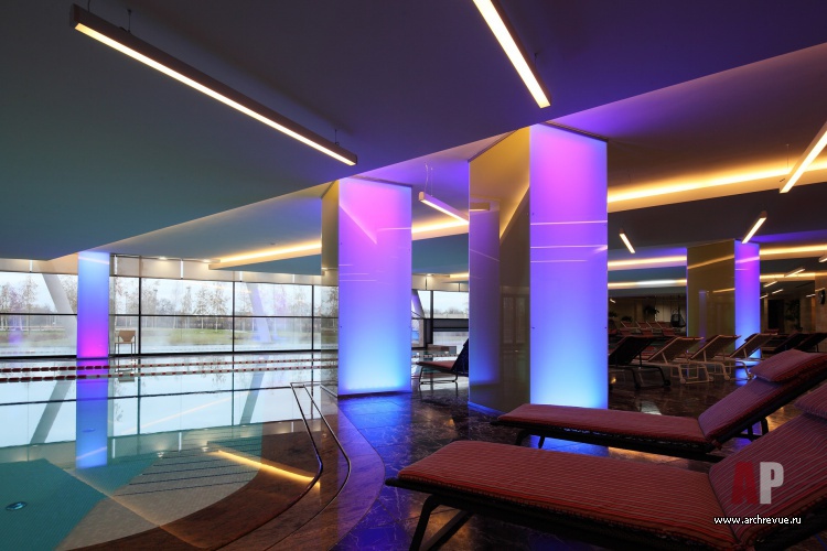 Важную роль в интерьере играет светодиодная подсветка с возможностью программирования различных световых сценариев. Колонны в бассейне, зашитые стеклом со встроенными светодиодами, выглядят как массивные светильники и знаковые декоративные элементы интерьера.