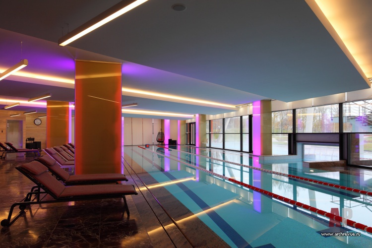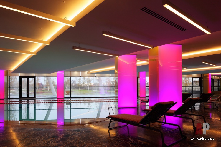Велнес-клуб расположен в элитарном поселке в Подмосковье и включает в себя все необходимое для спорта и отдыха. Архитектурную часть проекта выполнила «Архитектурная мастерская Асадова», интерьерными решениями занималось бюро «Лаборатория Виртуальной Архитектуры».