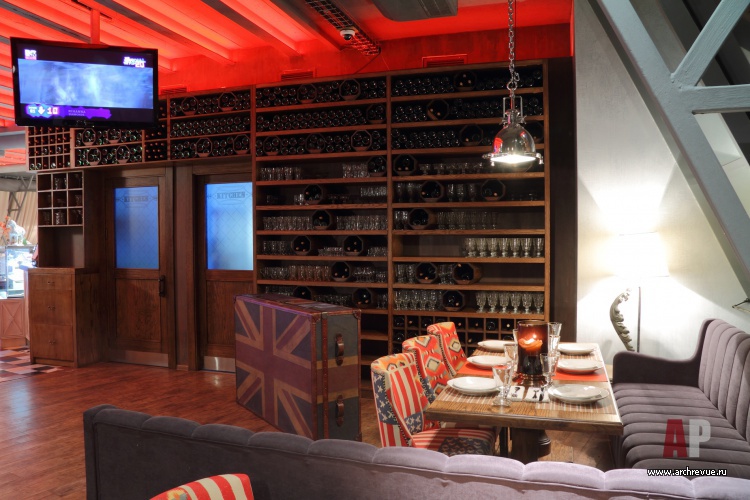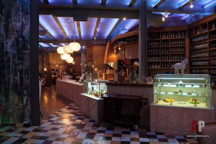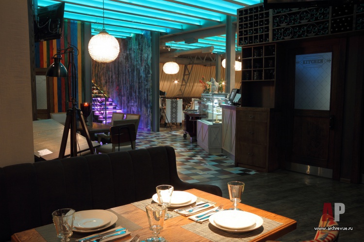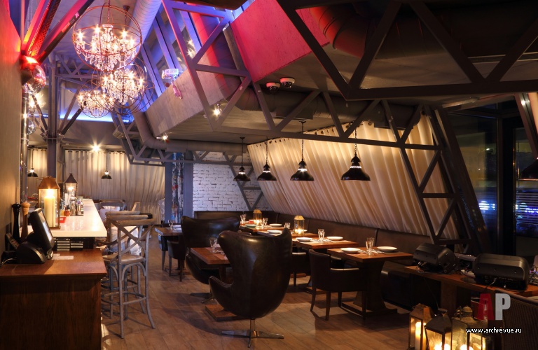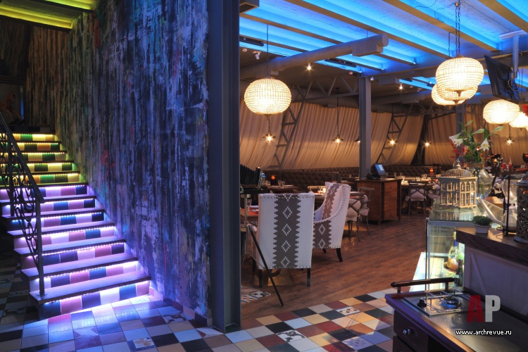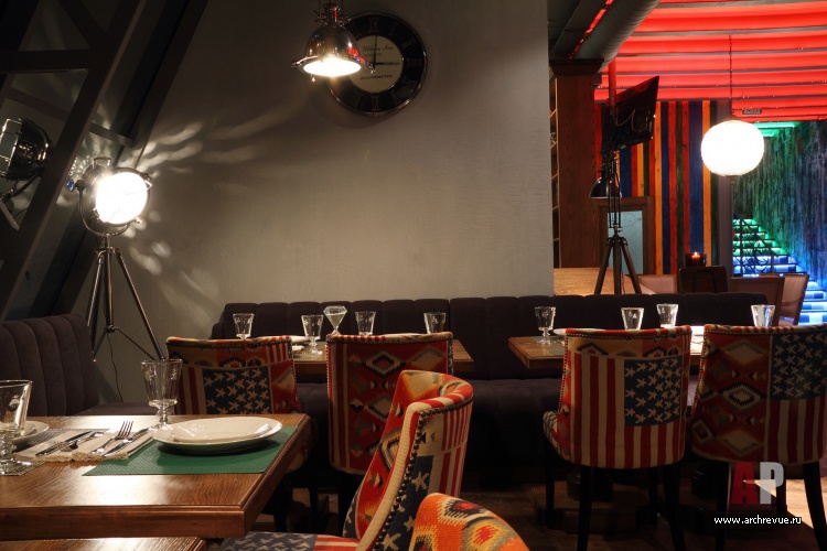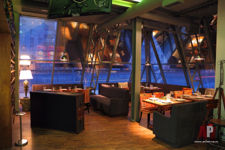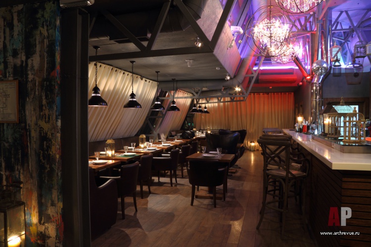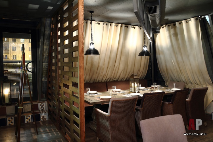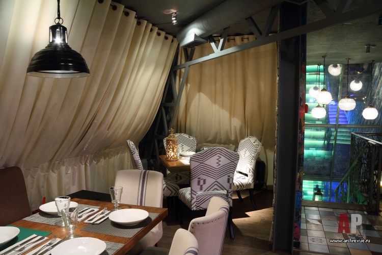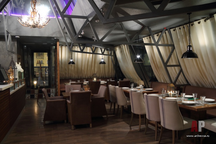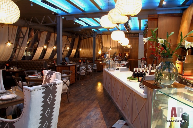 Интерьер аргентинского ресторана решен в стиле модного фюжн. Индустриальная тема, обозначенная металлическими балками и стеклянными витражами, сочетается с этникой и городским шиком. В отделке использовано состаренное дерево, испанская глазурованная плитка природных земляных оттенков, яркие, запоминающиеся аксессуары.