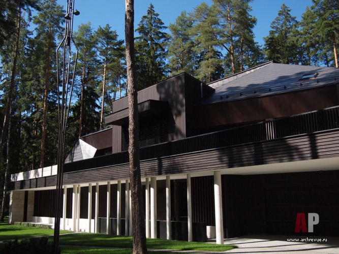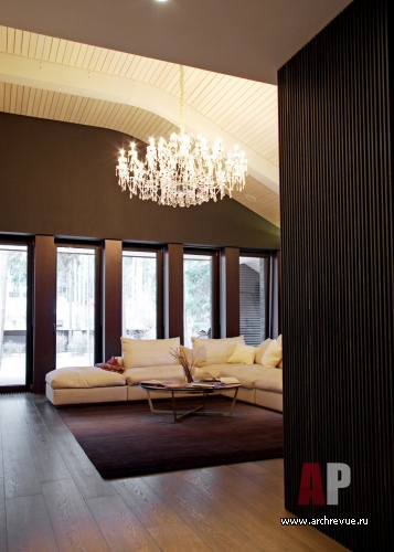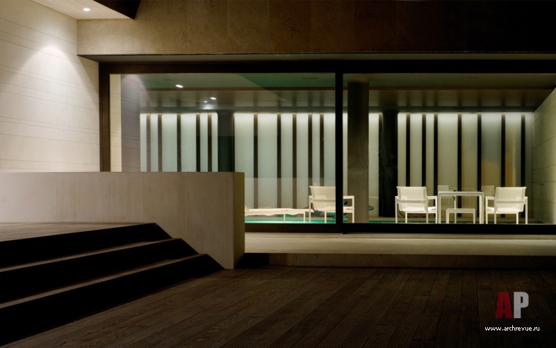 Первый этаж занимают гостевые помещения (гостиная, кухня-столовая), а также бассейн с панорамными окнами, с сауной и выходом на открытую веранду. На втором этаже находятся три спальни с ванными и гардеробными комнатами и кабинет. В цоколе размещены: домашний кинотеатр, винотека, а также технические и подсобные помещения.