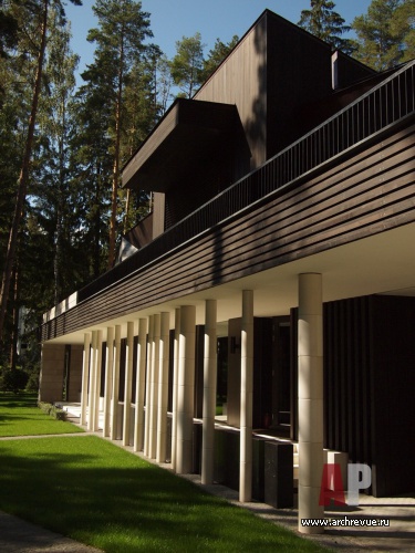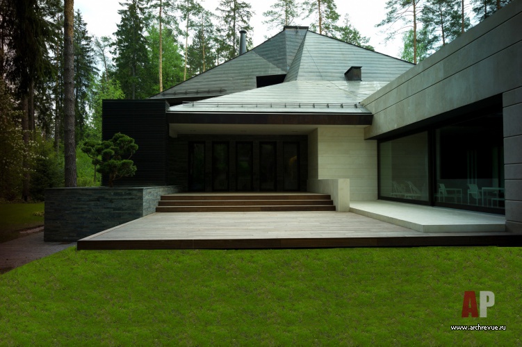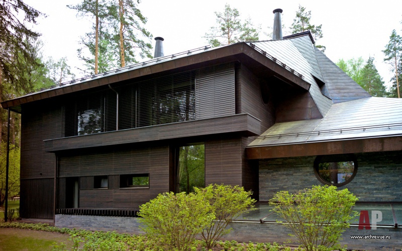 Снаружи старые стены были зашиты панелями из лиственницы, а общий объем накрыт медной кровлей. Чтобы стереть барьер между интерьером и экстерьером, были использованы панорамные окна. Увеличенный в объемах второй этаж с системой опоясывающих террас позволили расширить полезную площадь дома.