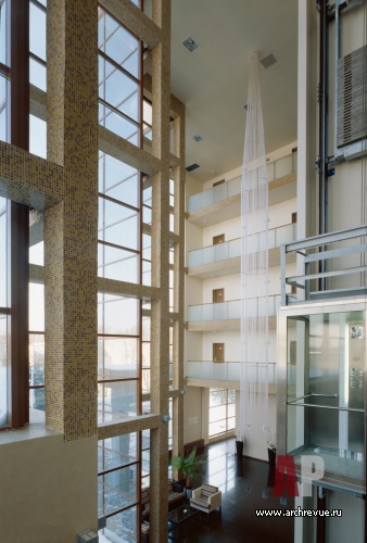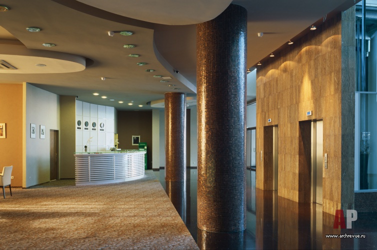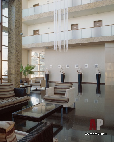 Архитектурная доминанта отеля – просторный атриум с уходящими под потолок галереями, панорамным лифтом и ниспадающим светильником из оптоволокна.