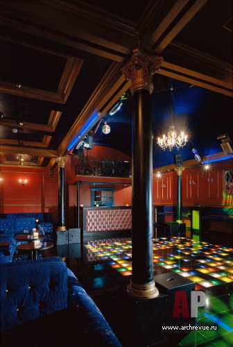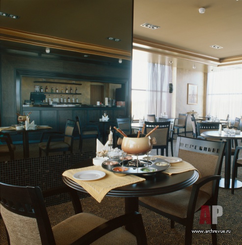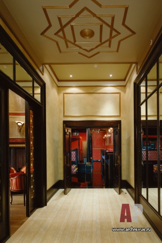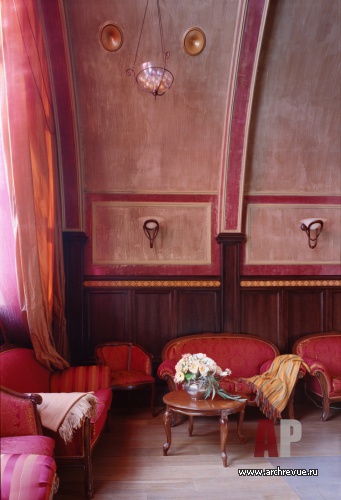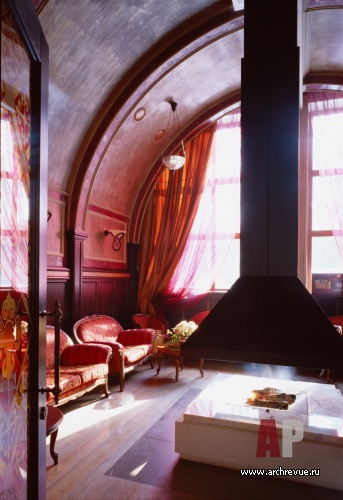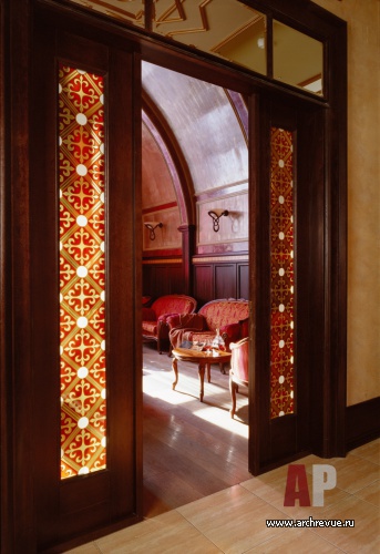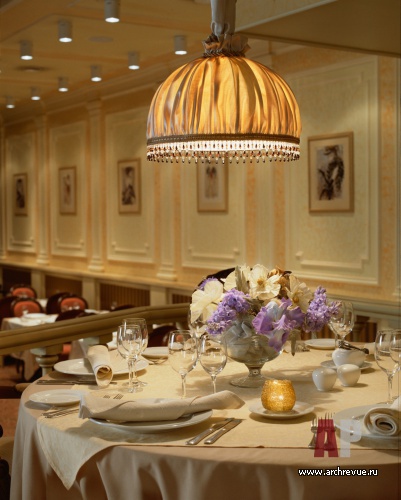 Каминный зал и вечерний ресторан декорированы в классическом стиле. Деревянные панели, лепные пилястры, распашные витражные двери, авторские светильники с тканевыми абажурами, сделанный на заказ островной камин, декоративные росписи придают интерьерам уникальность.