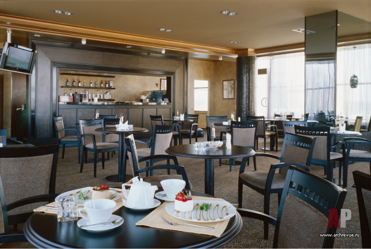 Современные интерьеры отеля выглядят элегантно и уютно. Пол входной зоны и лобби облицован крупноформатным керамогранитом с эффектом алмазной крошки. Колоны и вертикальные несущие элементы облицованы мозаикой. Стены отделаны декоративными покрасками в комфортной бежево-коричневой цветовой гамме.