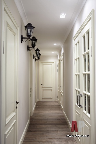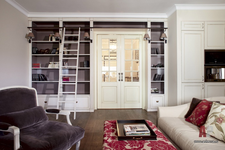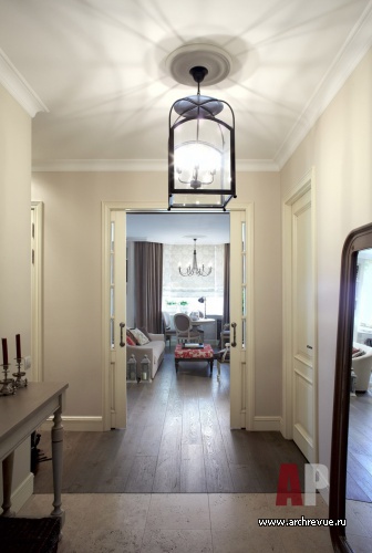 Основная идея оформления квартиры – городской функциональный интерьер с элементами спокойной классики. В оформлении присутствуют отсылки к стилистике Прованс. Двери, порталы дверей, кухонный гарнитур библиотека выкрашены в белый цвет с патиной. Полы выстланы широкой массивной доской из копченого дуба с приятной на ощупь фактурой.
